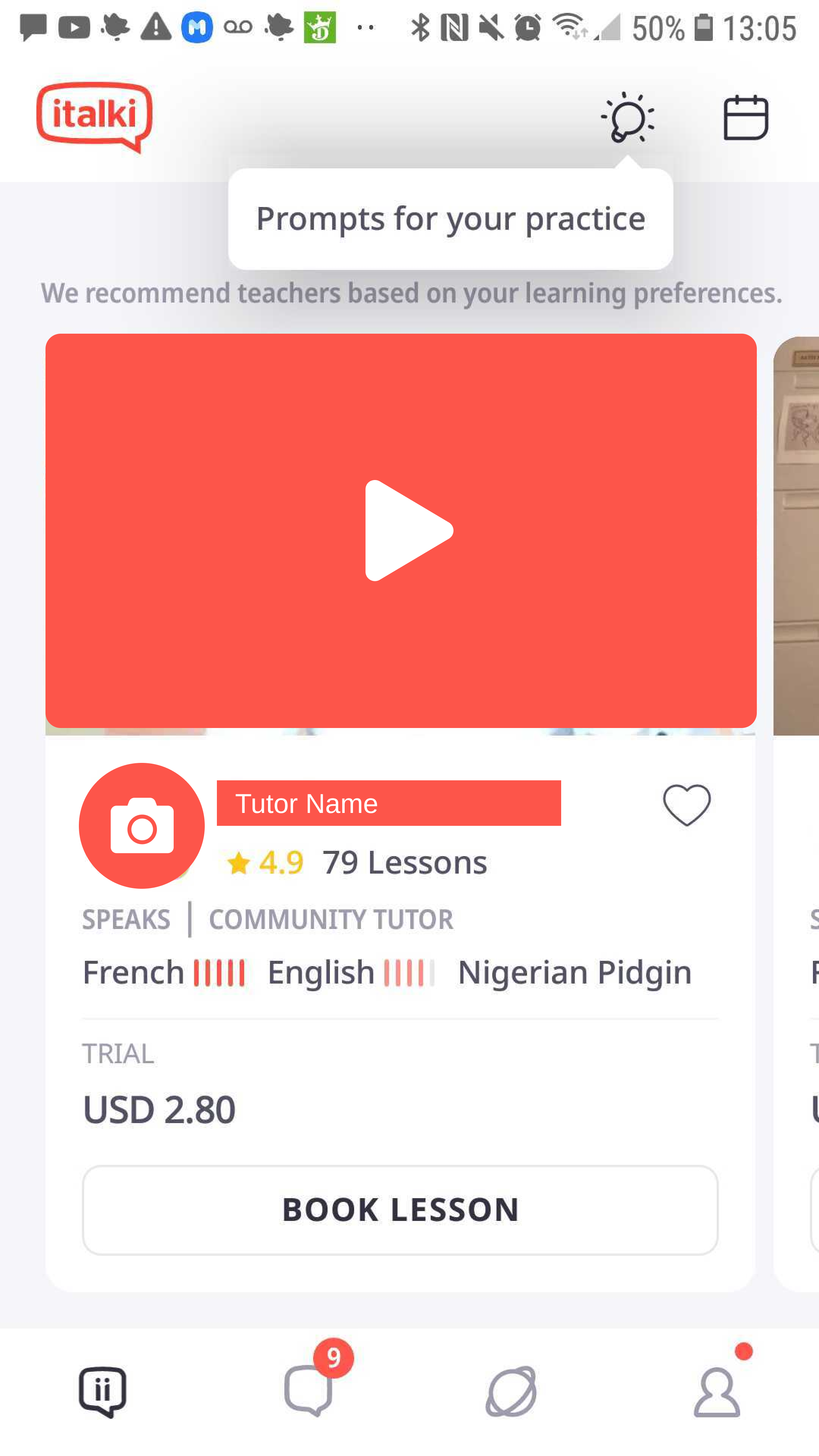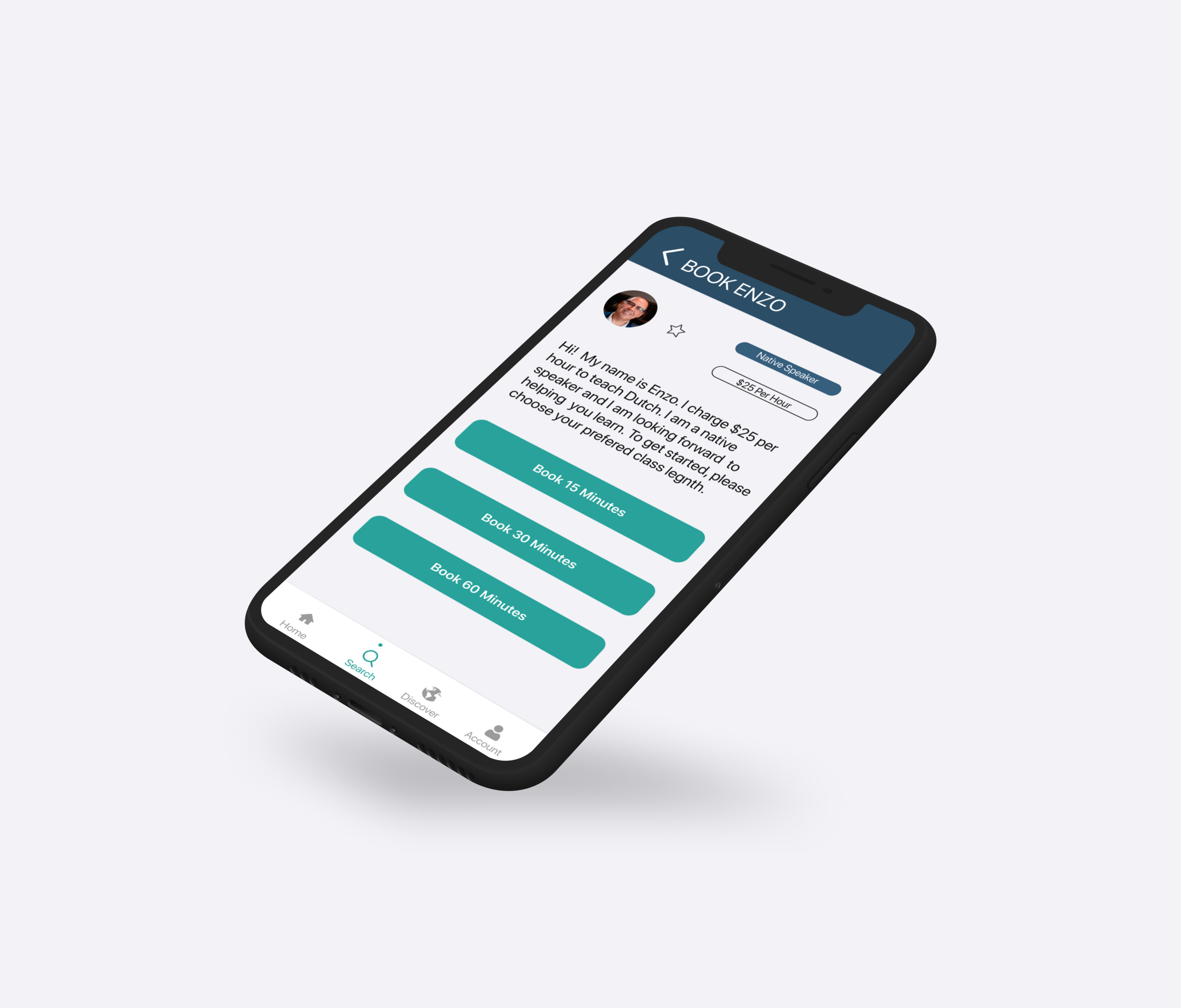 iTalki’s app provides an easy method to find a teacher on their homepage. A user can also book a teacher directly from their card or profile page.